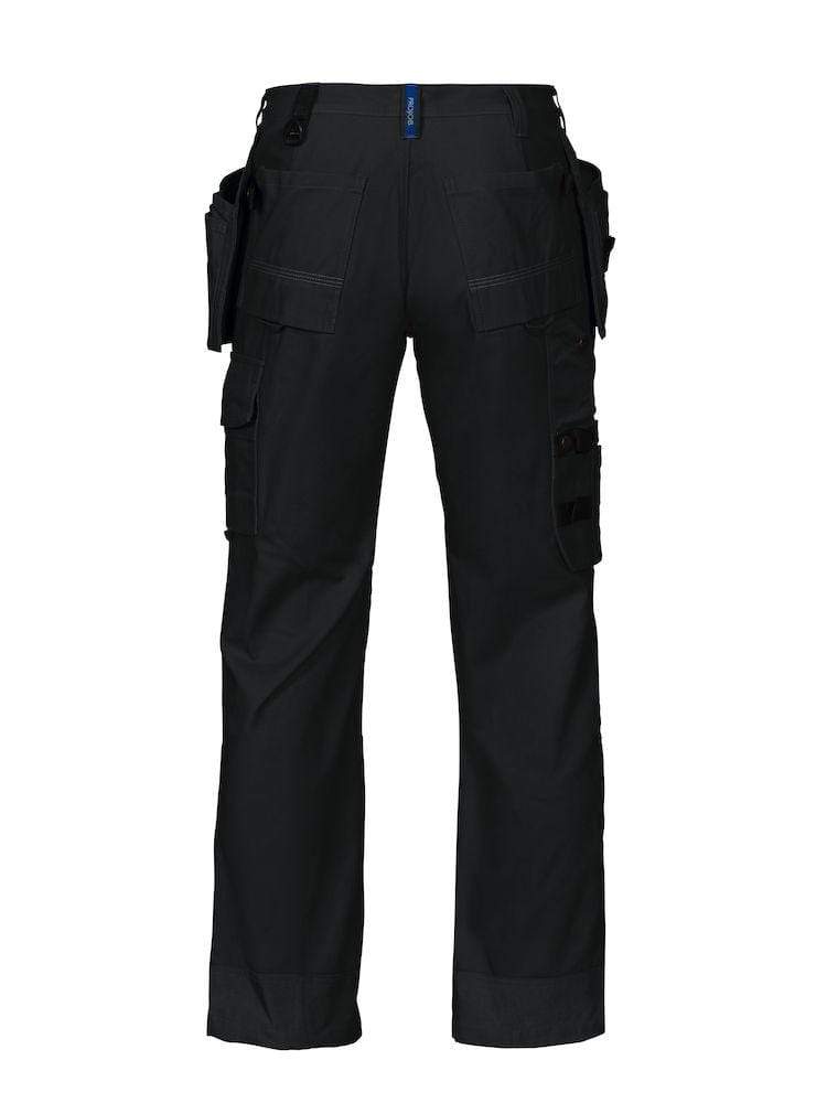 Gerade geschnittene Arbeitshose. Zwei Hängetaschen, die in die Seitentaschen eingesteckt werden können; eine mit Zusatztaschen und eine mit Werkzeugschlaufen. Die Hängetaschen sind mit 100% Cordura® verstärkt. Links Beintaschen für das Mobiltelefon, für Schreibgeräte und Werkzeugschlaufe. Zwei verstellbare Hammerhalter. Zwei D-Ringe. Rechts Metertasche mit Werkzeugschlaufe und Knopf. Verstärkte und vorgeformte Kniepartie aus Cordura®, Öffnungen auf der Innenseite des Hosenbeins für Knieprotektoren. Hinteres Beinende mit Cordura® verstärkt. Extragrosse Gesässtaschen.