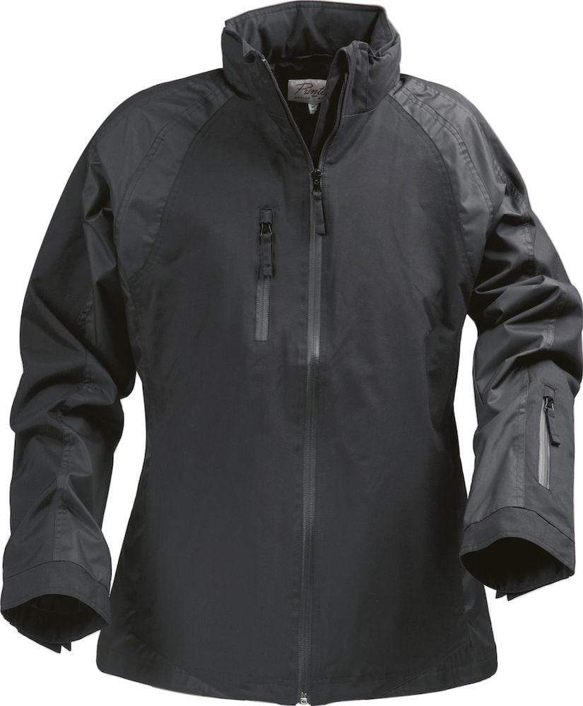 Sportliche, wind- und wasserabweisende Jacke für Damen aus einem Nylon-/Polyestergewebe. Innen beschichtet. Polyesterfutter. Schwarze Reißverschlüsse. Zwei Außentaschen, eine Innentasche, eine Brusttasche und eine Ärmeltasche – alle mit Reißverschluss. Abnehmbare Kapuze mit Reißverschlussöffnung und Reißverschluss im Futter der Jacke, zur Vereinfachung der nachträglichen Veredelung. Zwei Ventilationsöffnungen mit Reißverschluss im Rücken. Gummizug am Saum und an der Kapuze.